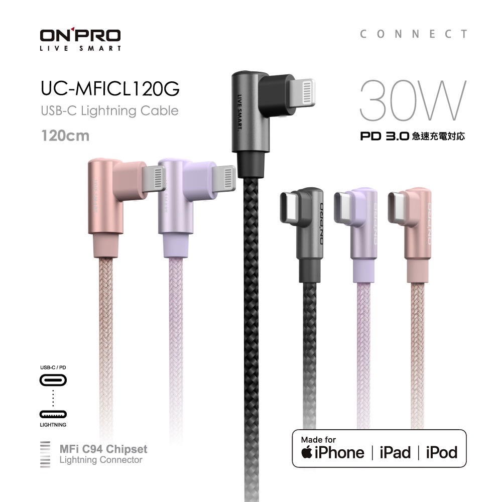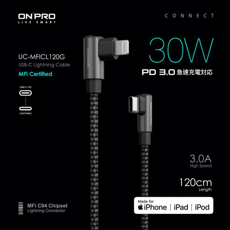 ONPRO UC-MFICL120G Type-C to Lightning PD30W快充充電線是您的不二之選。