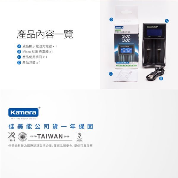 Kamera LCD-26650 液晶雙槽充電器多功能設計,LCD螢幕顯示電量,並採用Micro USB輸入孔,內附線材連接自備之USB插頭、行動電源…等充電設備,方便快捷,且內置智能防護電路芯片,有效防止過充、過壓、過流、過熱、短路保護,兼具絕緣散熱、抗耐磨等特性!