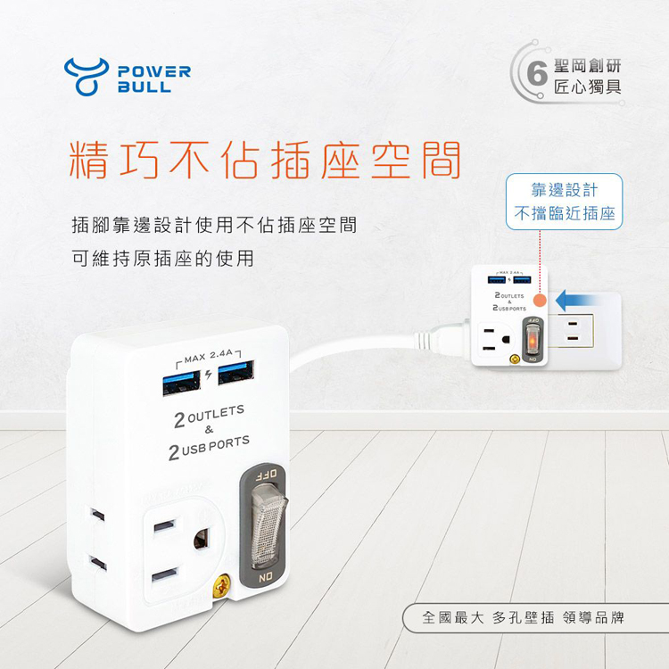 【POWER BULL PB-60U 2孔USB充電器 + 一開2插節能分接插座】- 增添插座功能,充電無憂,節能又便利!