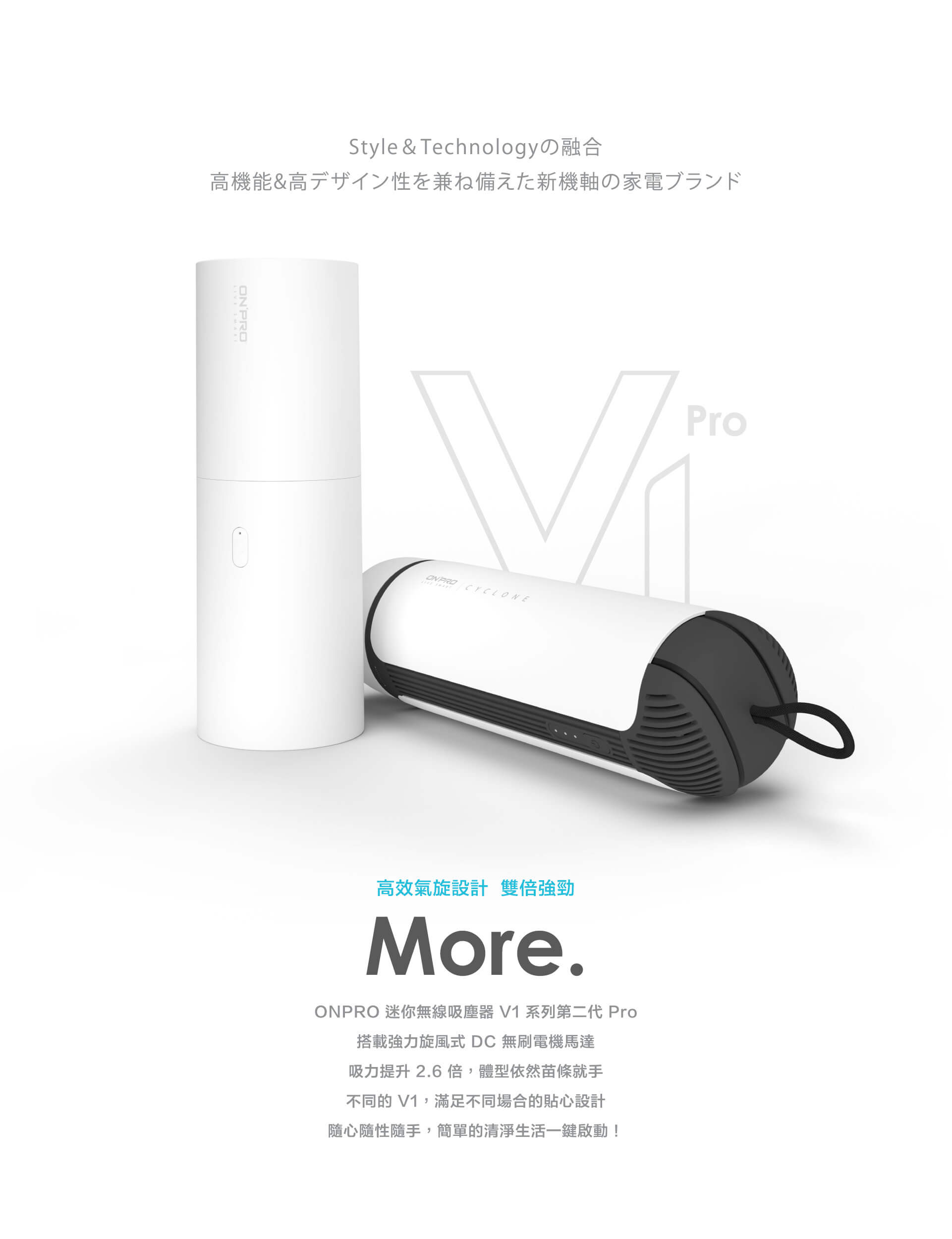 .內容物:V1 Pro吸塵器(含濾芯x1)、長柄扁頭吸嘴、刷毛吸嘴、USB-C充電線、絨布收納袋、使用說明書